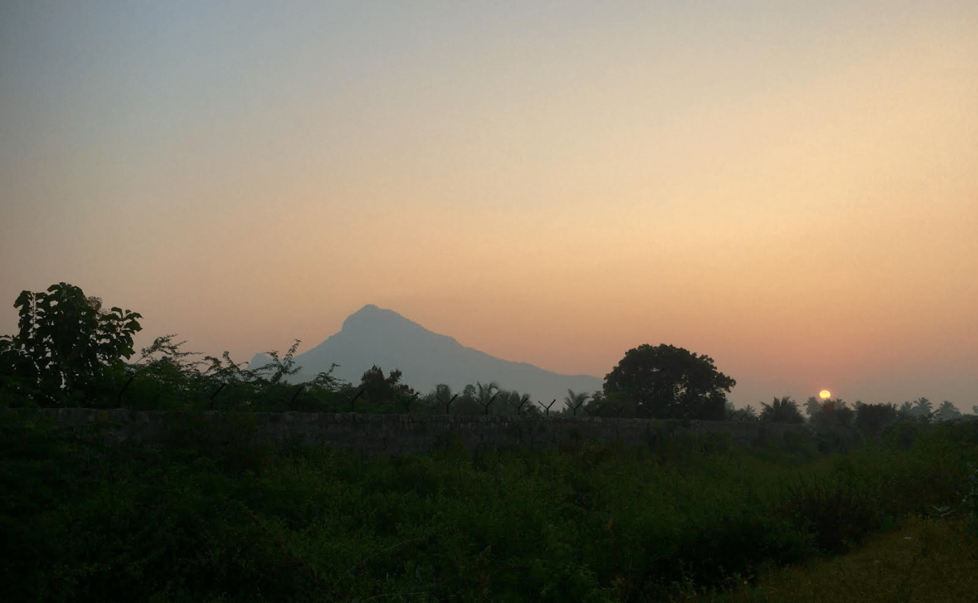 Wake before dawn. The sun has not yet risen on another year, but last night’s music still hangs in the air. Don a jumper for the first time in weeks and straddle the bicycle you can rent for just 40p. Say hello to the cook walking her cow. Say hello to three children riding one bicycle. Say hello to the holy mountain, Arunachala.